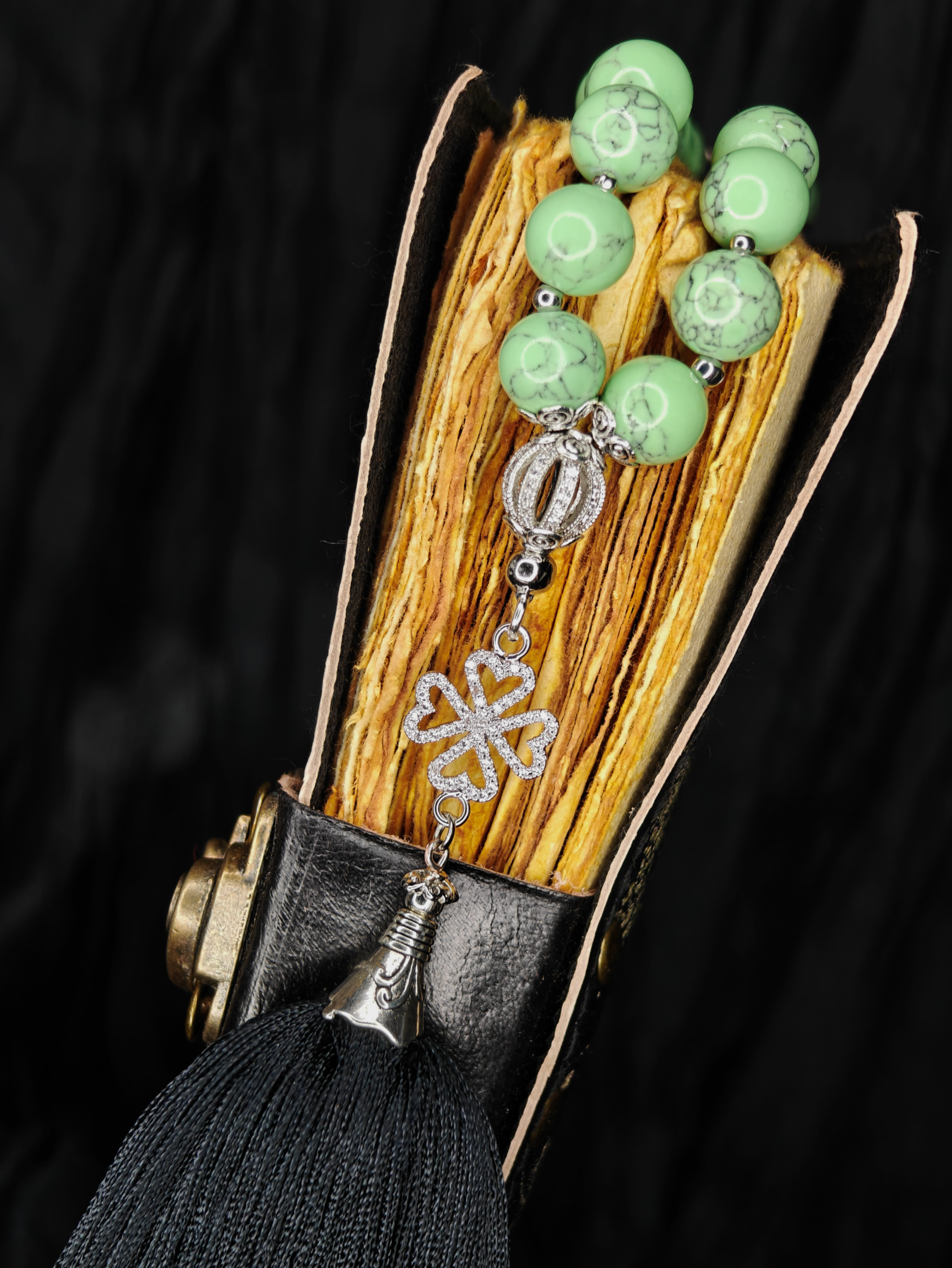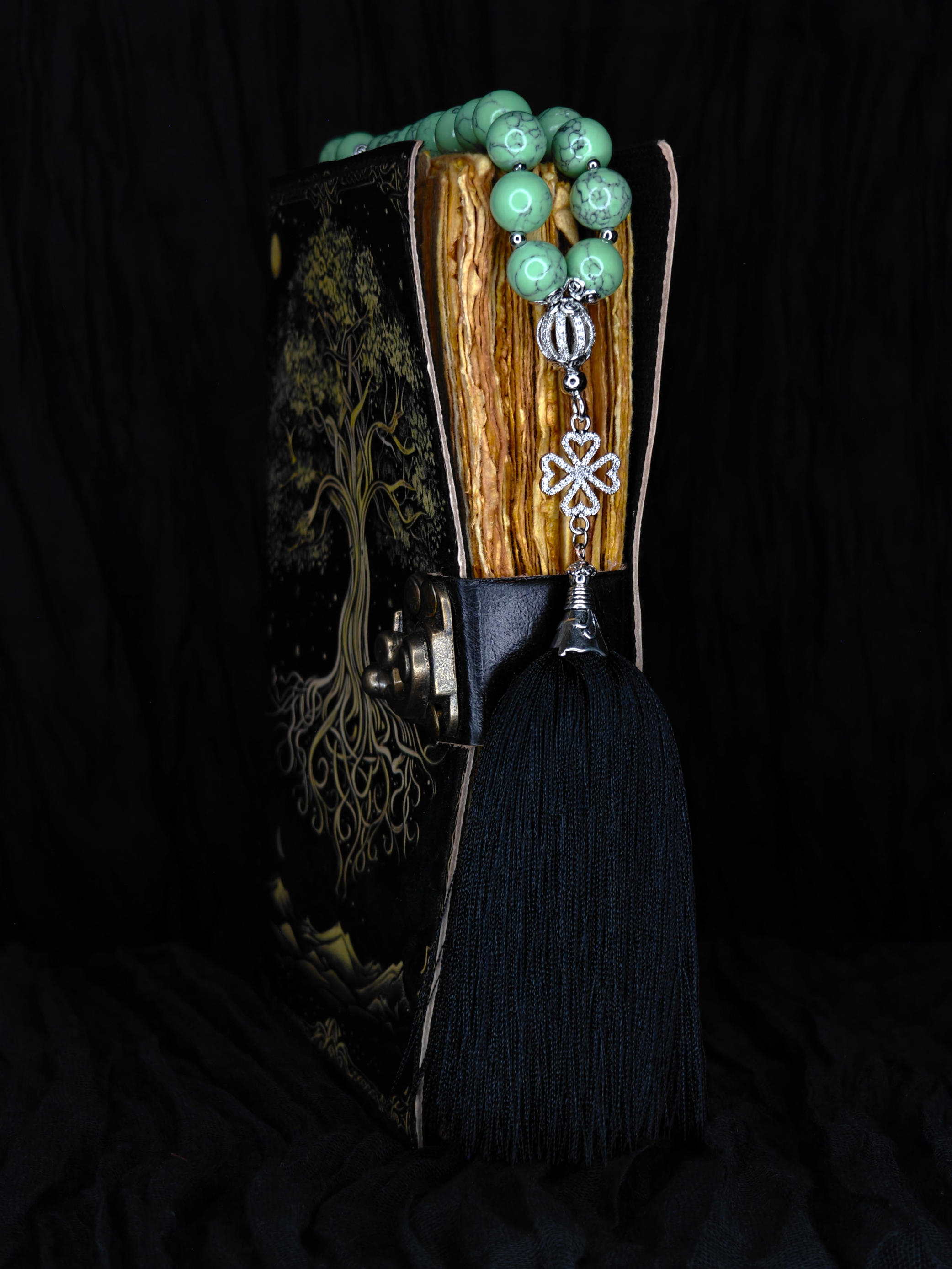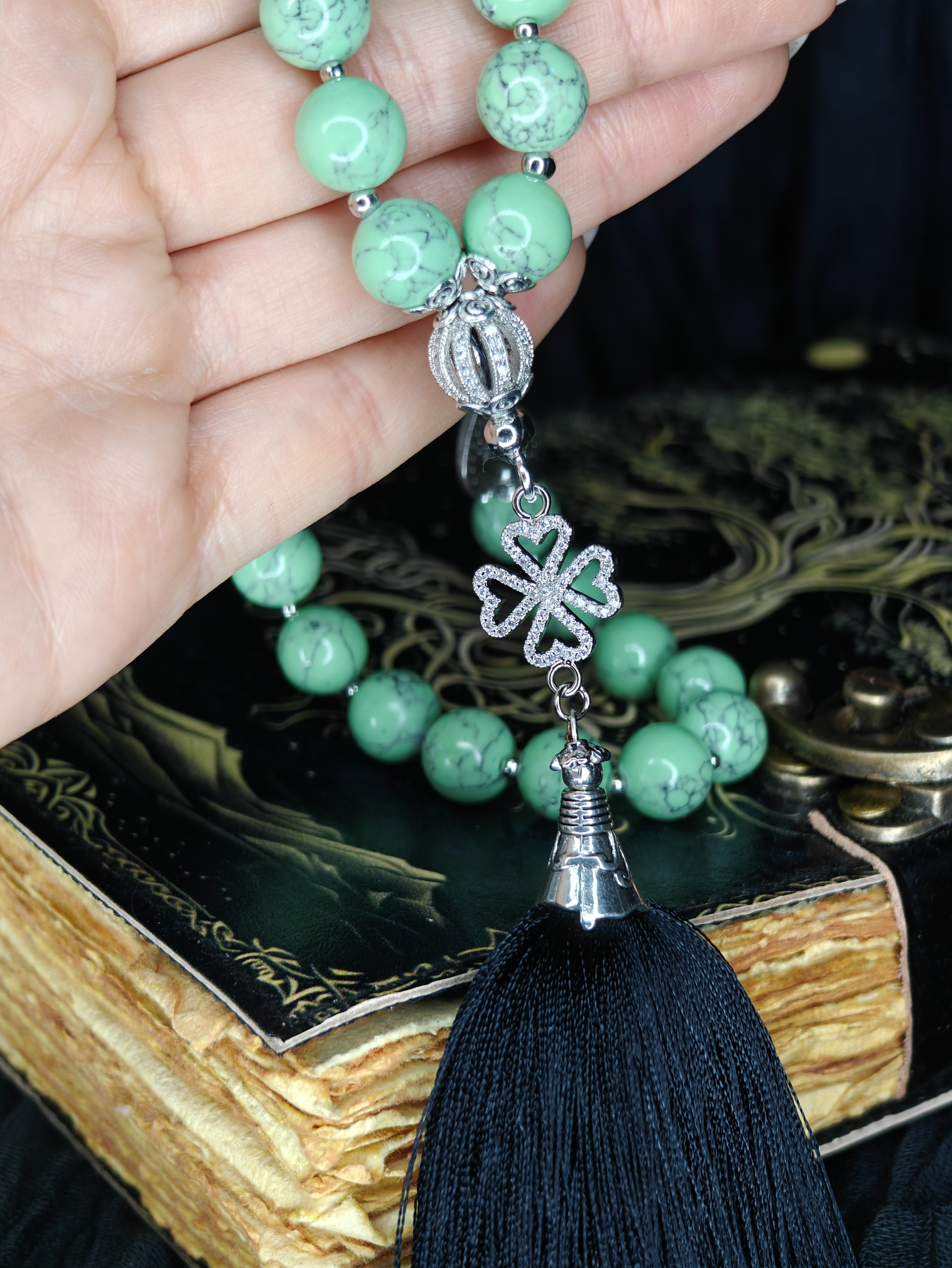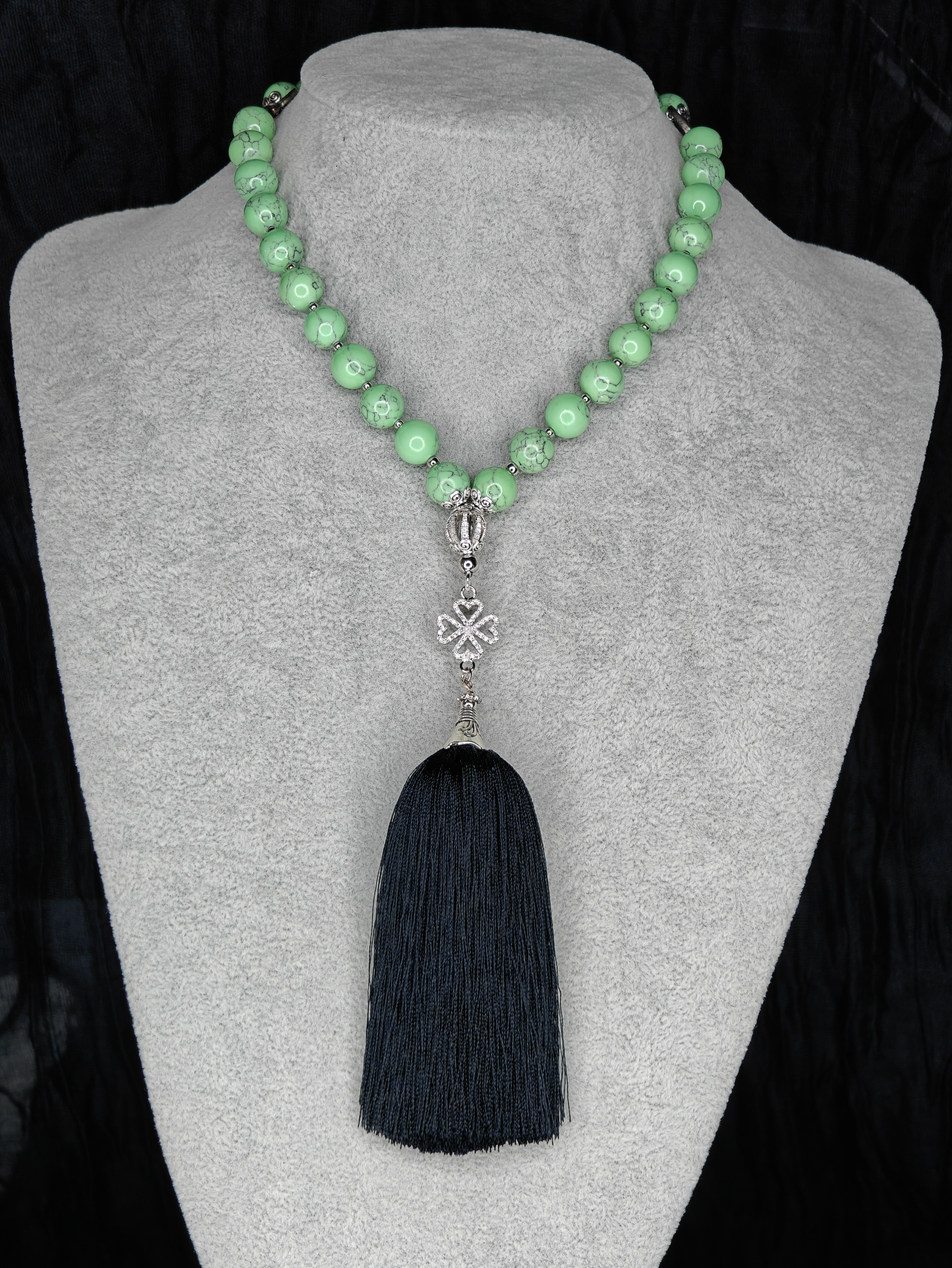 Бусины из мятного хаулита — прохладного, нежного, умиротворяющего. Каждая — 10 мм, приятно и весомо ложится в ладонь. В сердцевине — клевер с искорками фианитов, символ удачи и света. А завершает всё струящаяся кисточка из мягкой вискозы черного цвета.