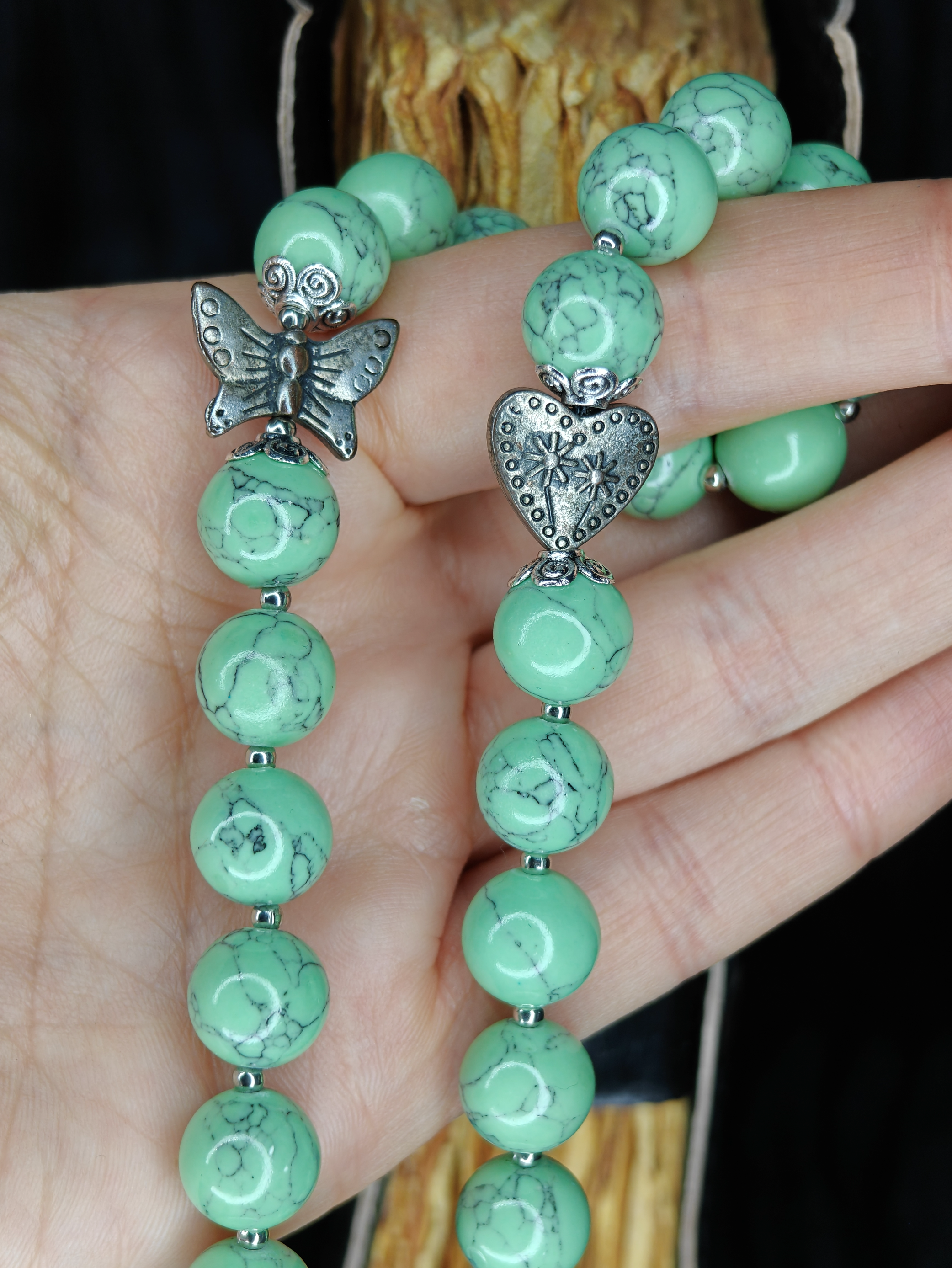 Тридцать три бусины, как три ступени к внутренней гармонии. Три раза по одиннадцать. Между ними — знаки сердца и лёгкой бабочки: напоминание о любви и преображении.