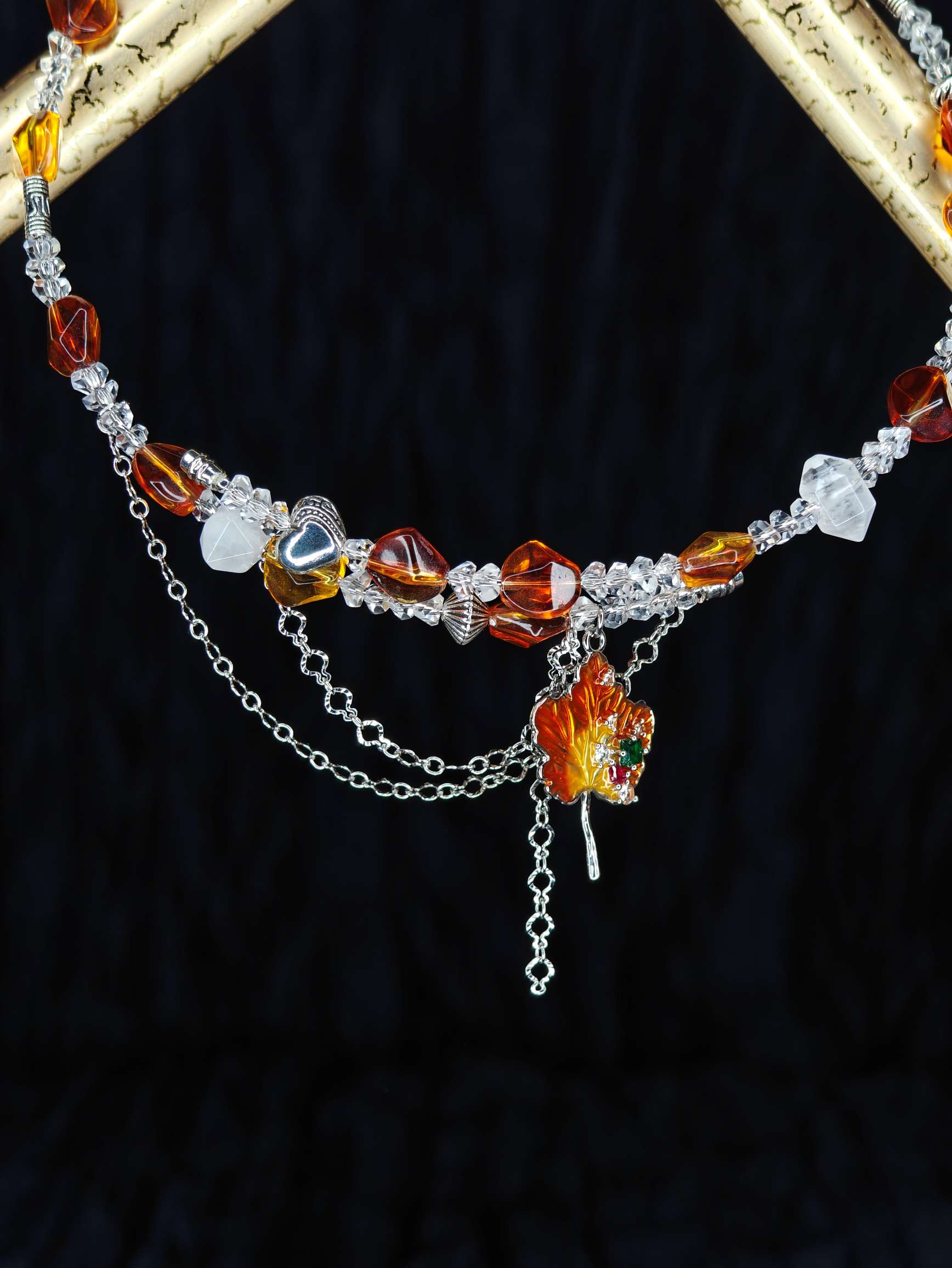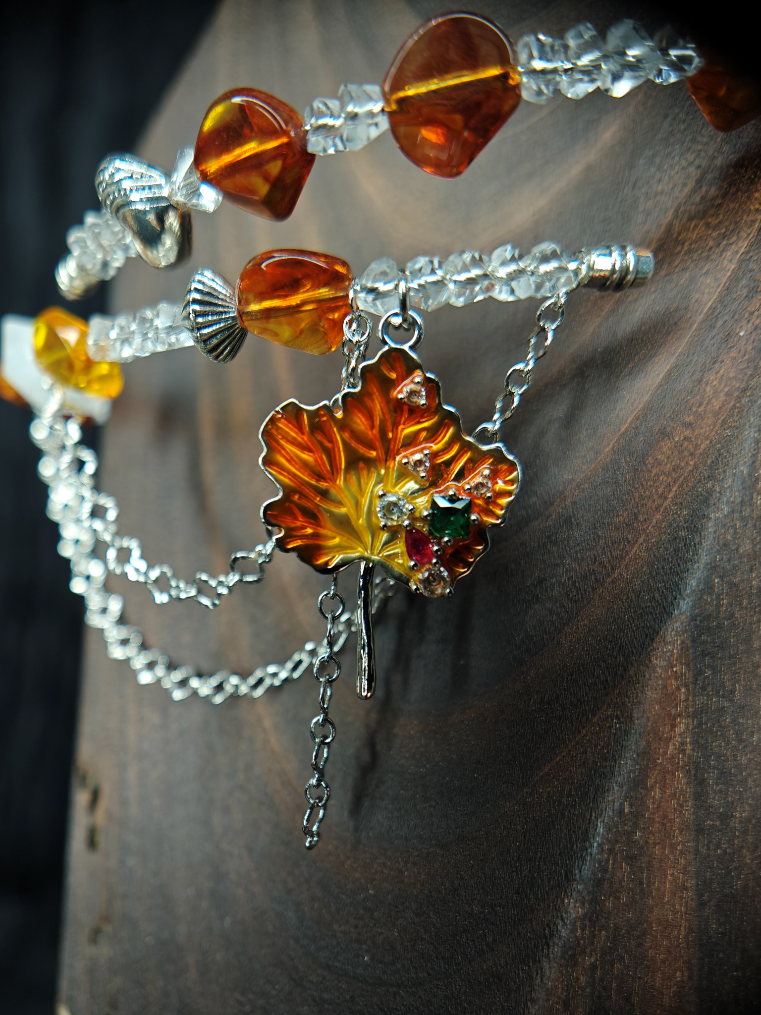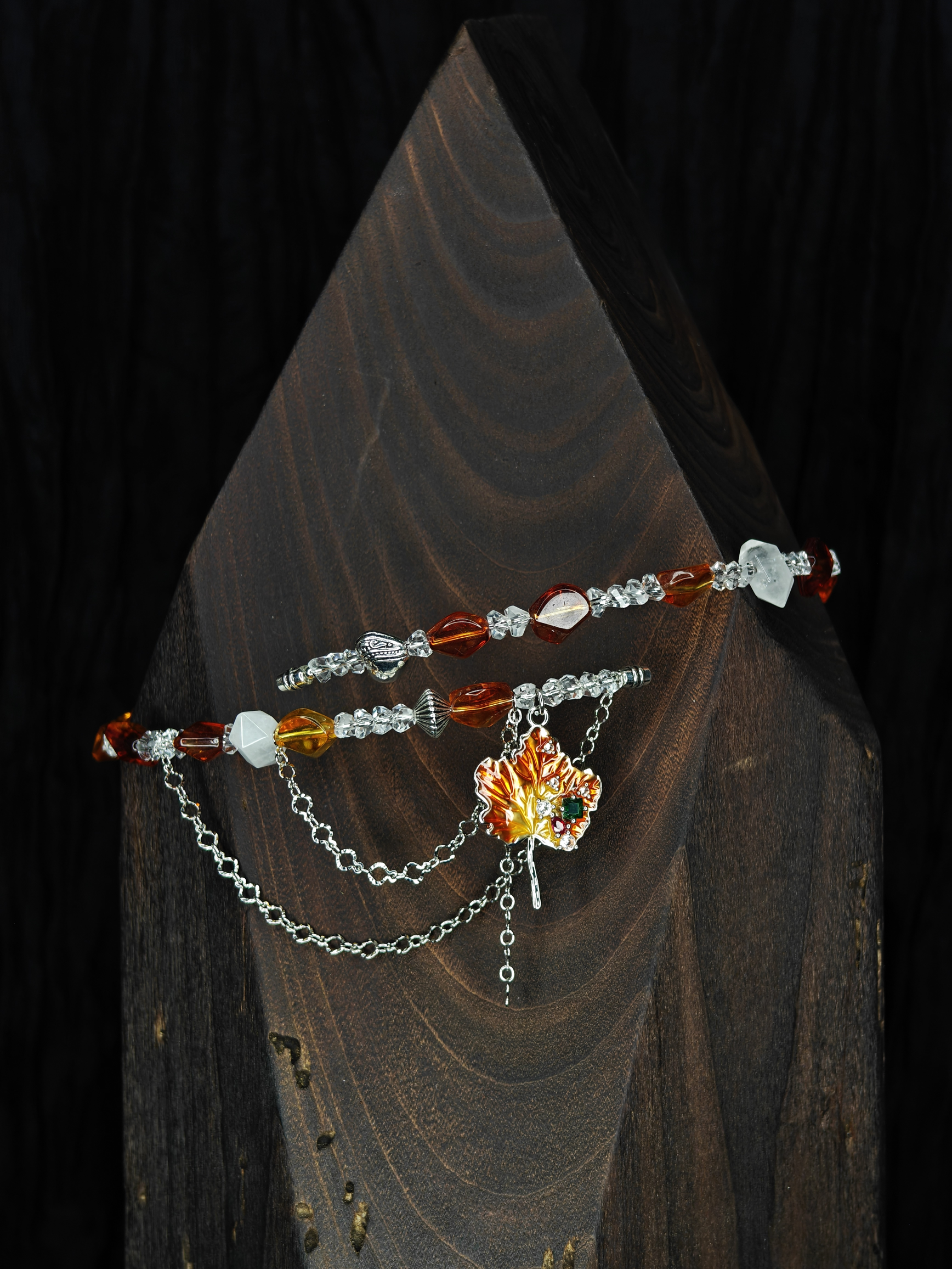 В этом чокере — память о пламени Муспельхейма, застывшая в янтарном акриле и прозрачном стекле. Осколки инея из Нифльхейма — белые матовые бусины и холодный молочный кварц в невероятной огранке. А в центре, опутанный серебряными цепями, горит кленовый лист. Он огненно-медовый, как золотые яблоки Идунн, дарящие вечную молодость.