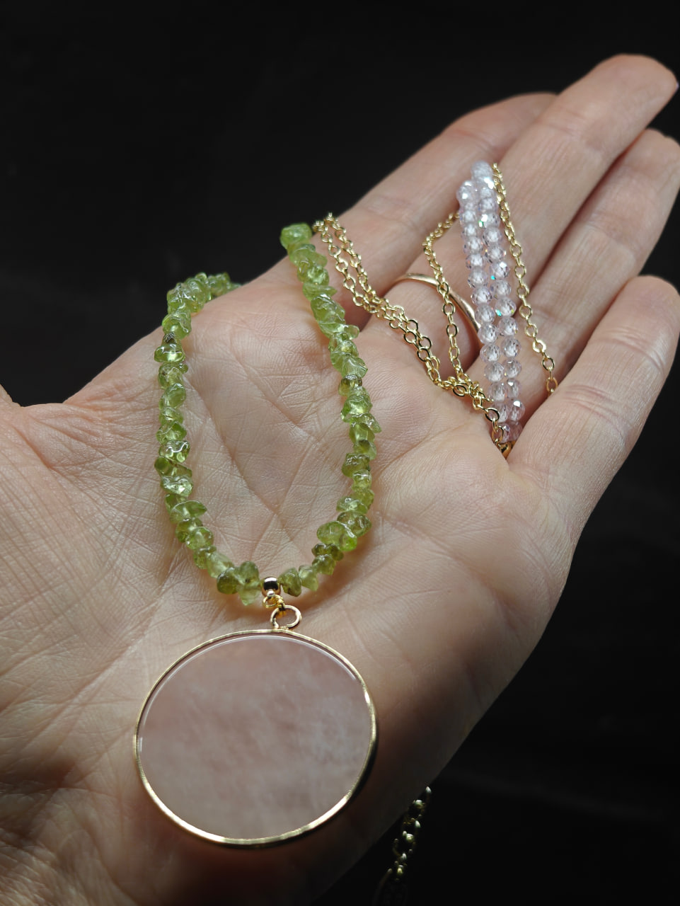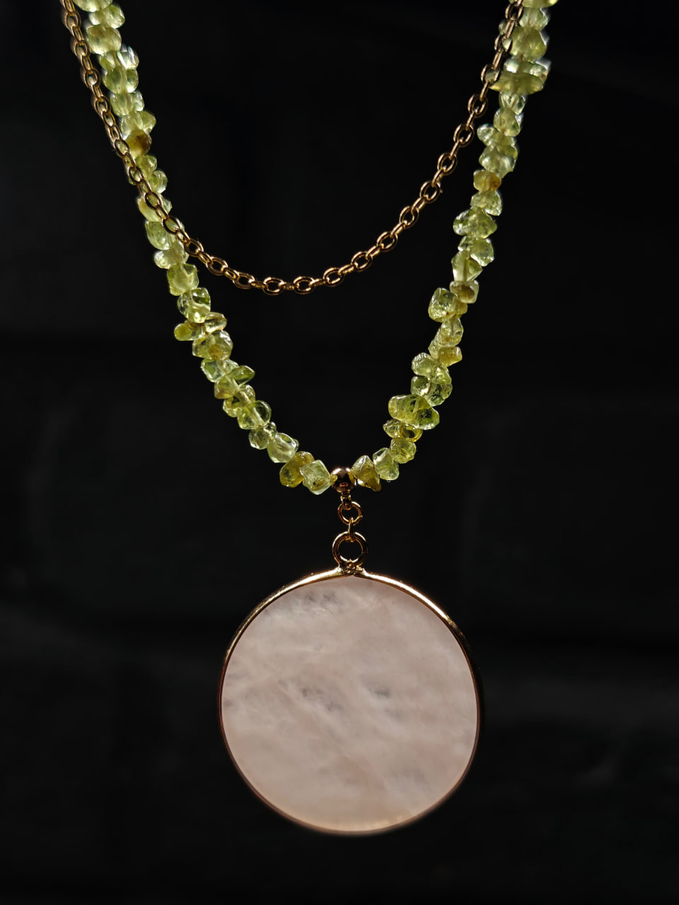 ▫️Фурнитура: золотого цвета (цепочка, замочек, крупная круглая подвеска 3см из розового кварца).