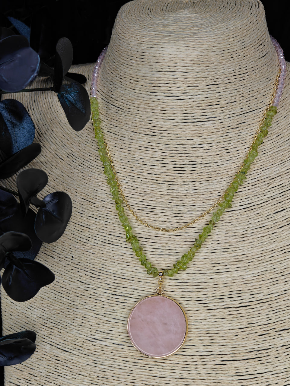 Крупная подвеска из розового кварца собирает композицию