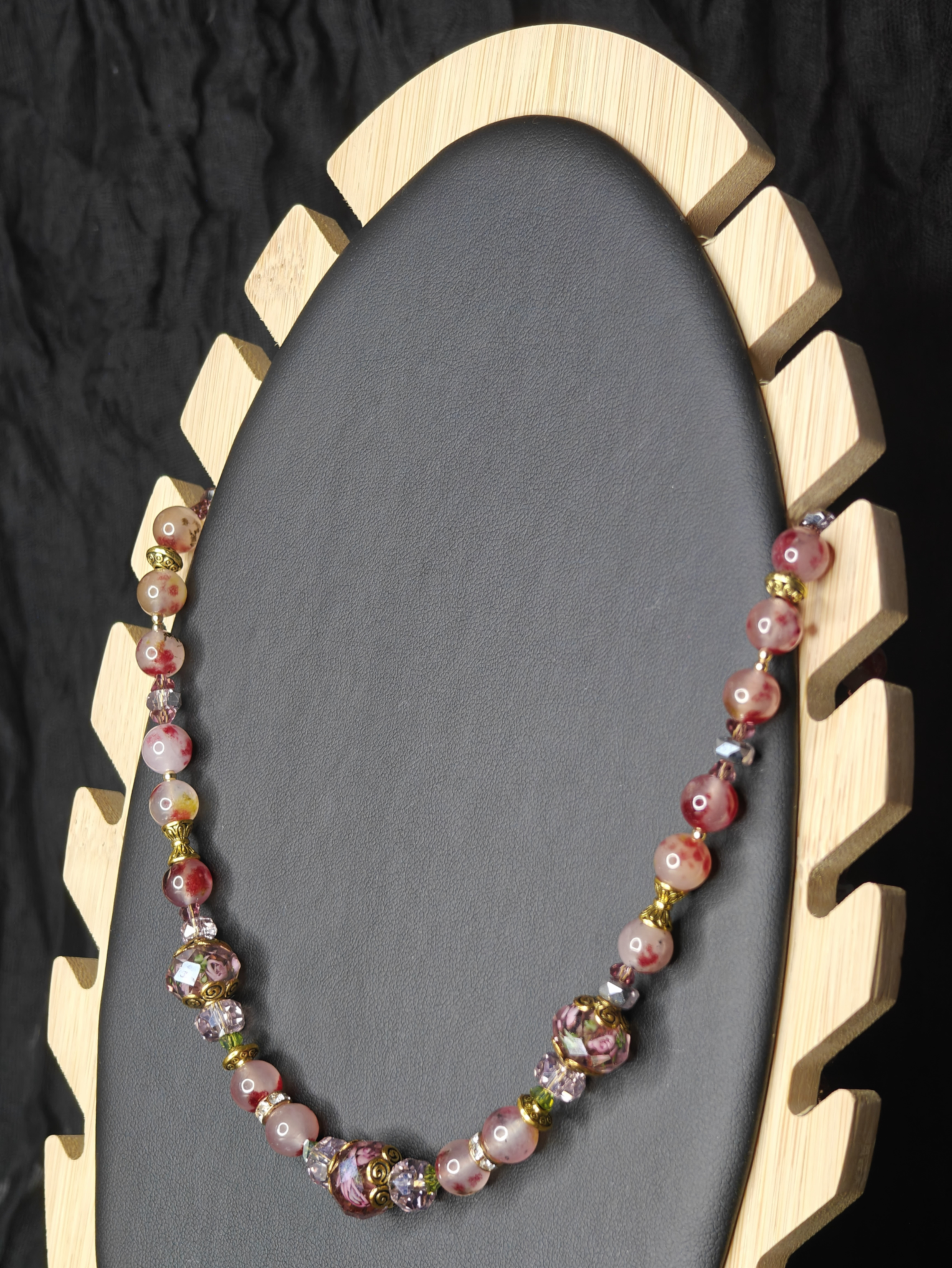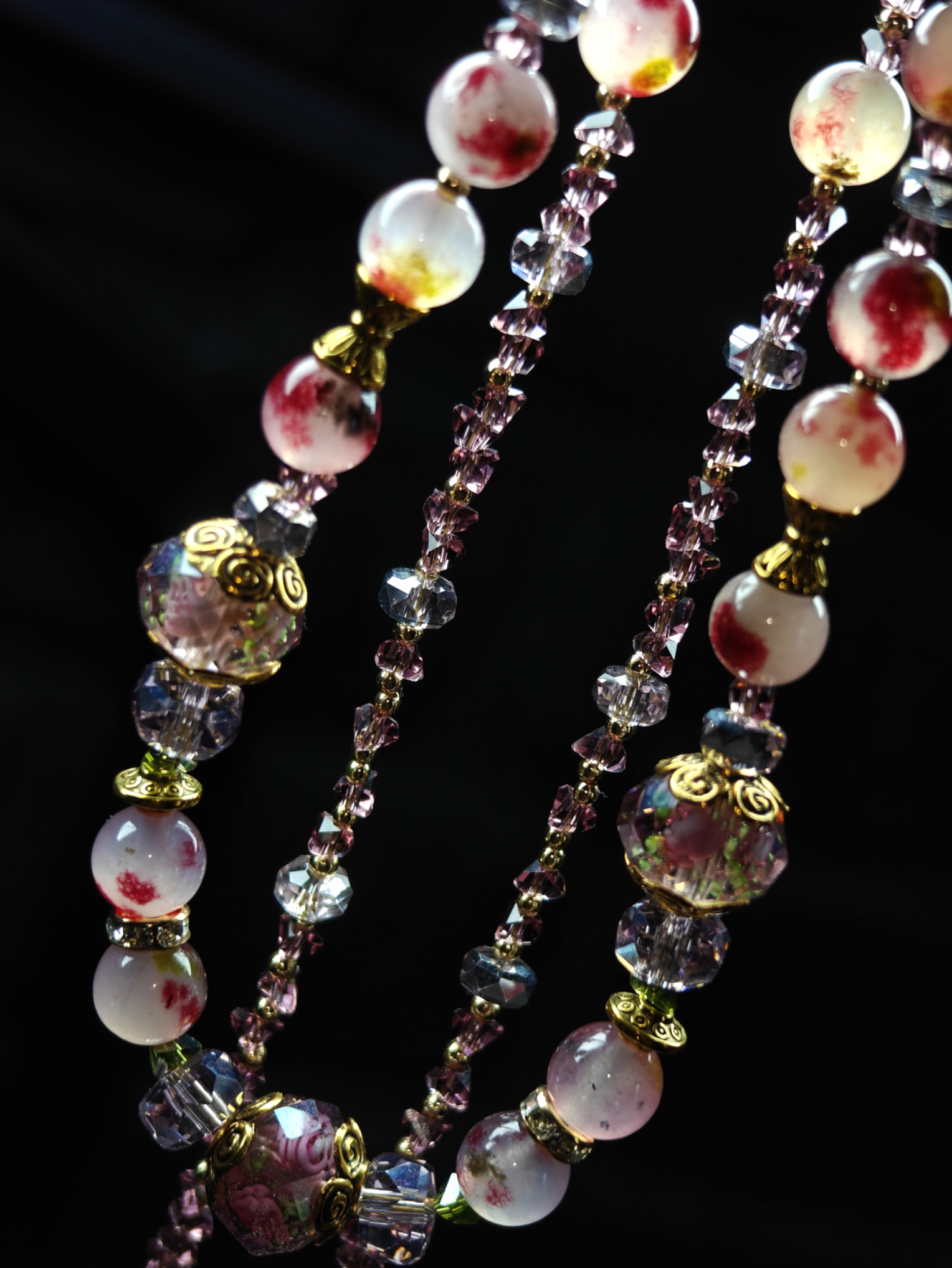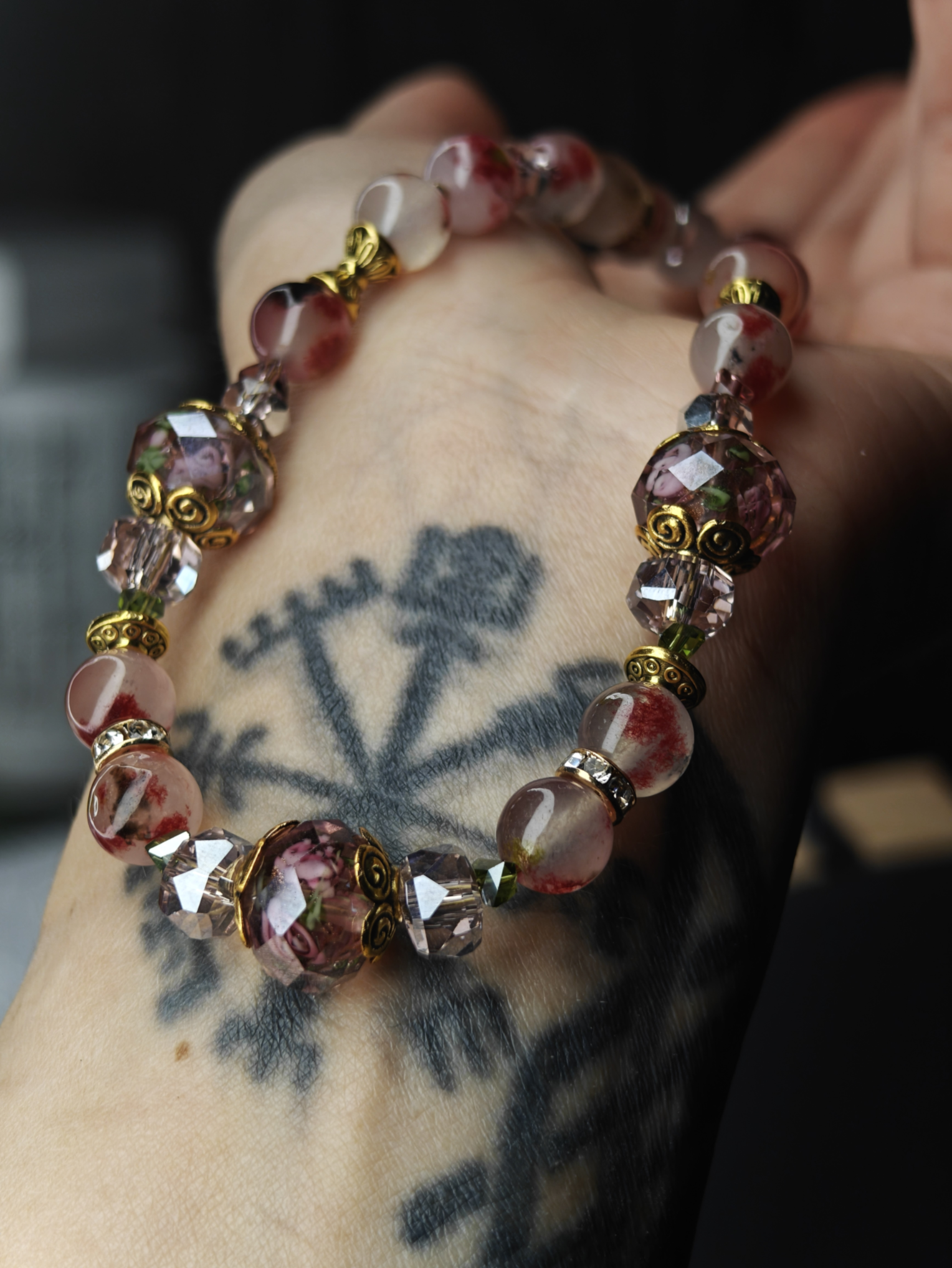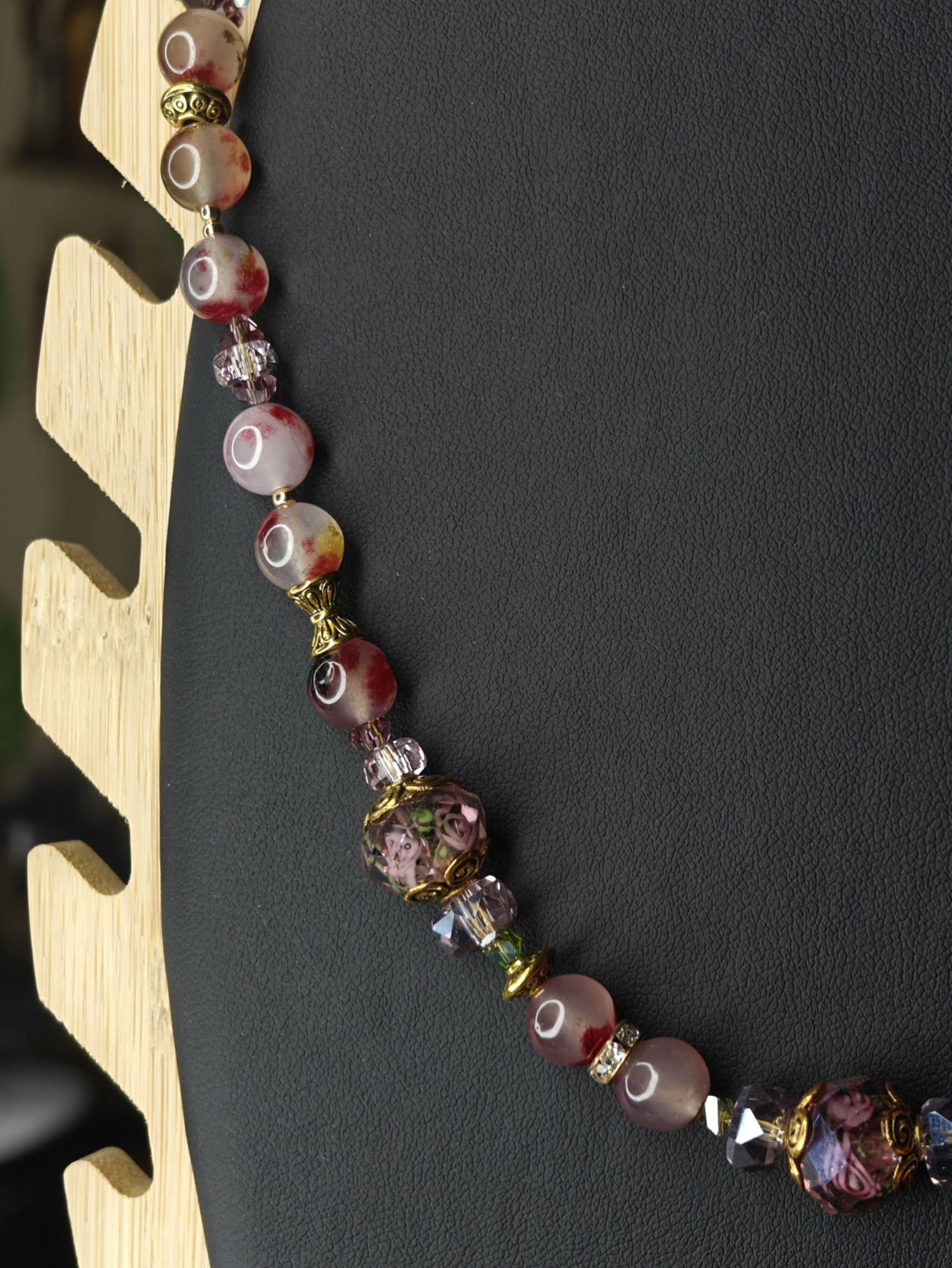В этом колье — мягкая зелень крыжовника, нежный румянец розы и трепетный лиловый отблеск родионита. Оно сверкает и вздыхает хрустальными фактурами. А в сердце, в обрамлении золотой фурнитуры, скрыты три бусины из муранского стекла с крошечными розочками внутри.