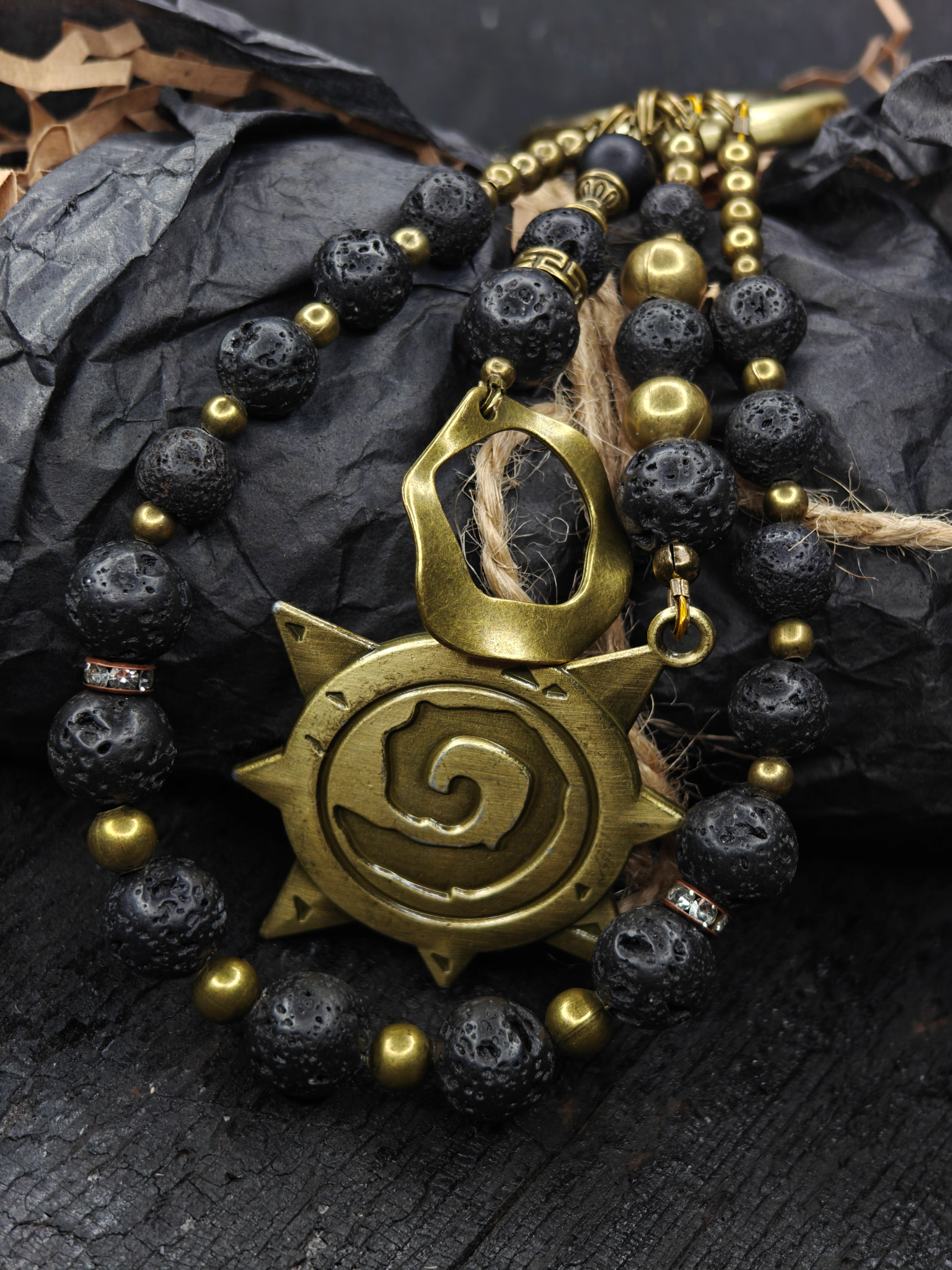 В центре этого творения пылает Сердце Камня — знак вечного очага, что горит даже в самой глубокой тьме подземелий. Но истинная магия скрыта в черных бусинах. Это не просто камень. Это окаменевшая кровь дракона — лава, что видела рождение миров. Остыв, она стала броней: черной, как бездна, но хранящей внутри тепло победы.
