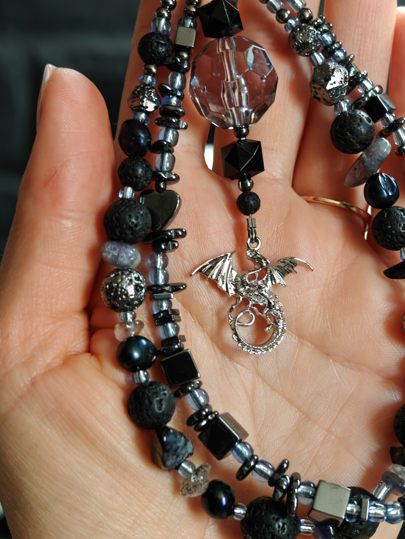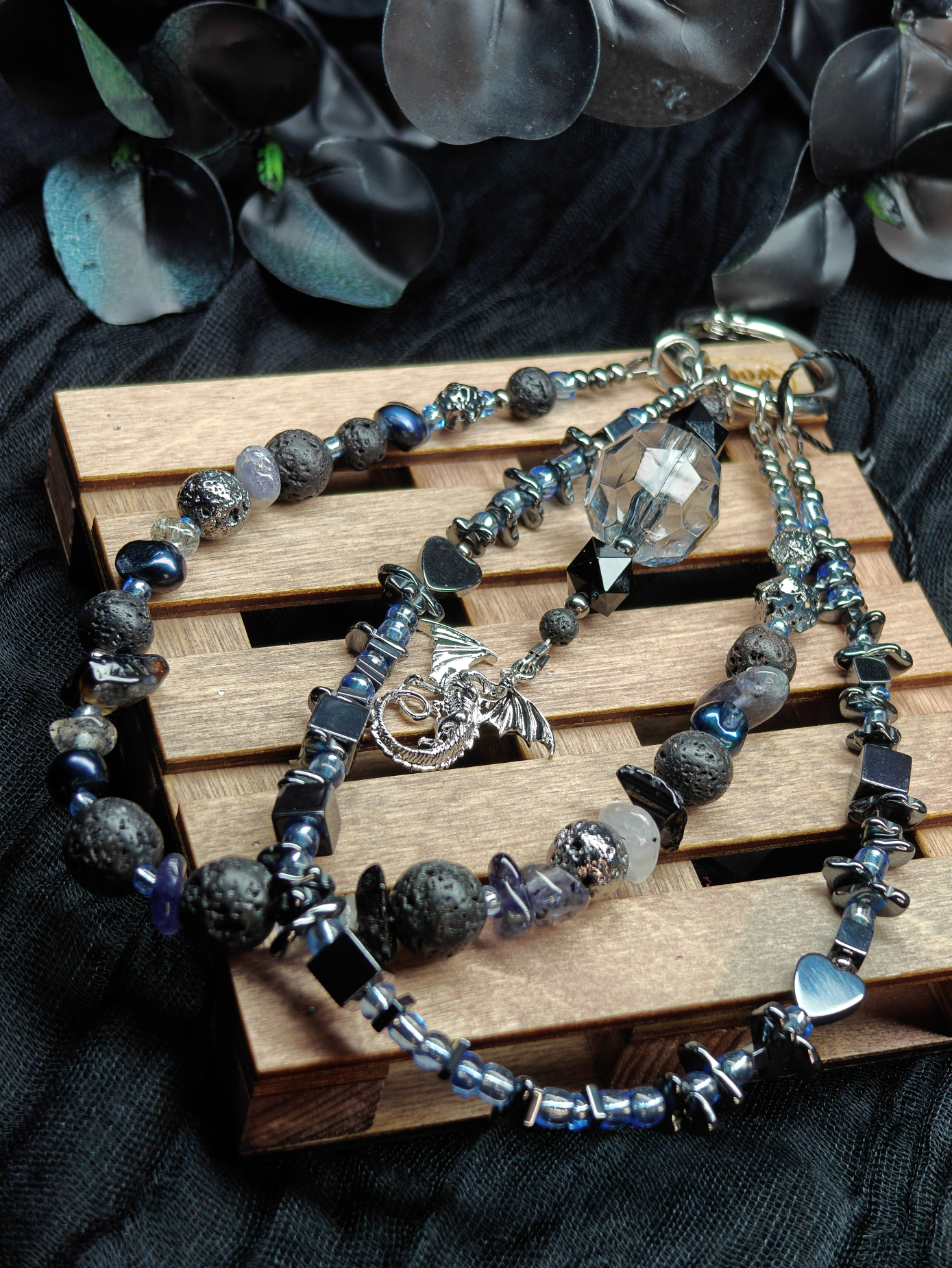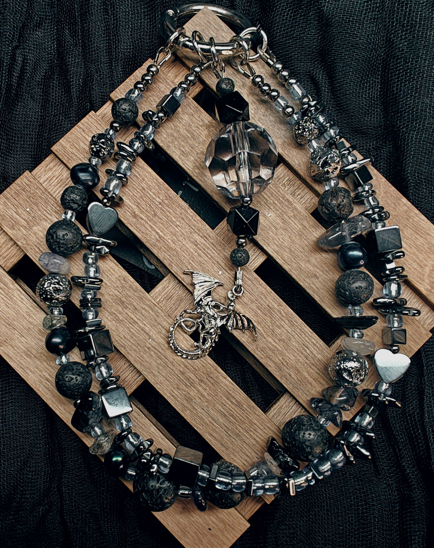 В центре внимания — дракон. Не мифический, а вполне реальный в своей силе. Серебряная фурнитура связывает всё в единую стальную конструкцию, а акриловые бусины и бисер создают эффект «дыхания дракона» — лёгкого, но заметного мерцания.