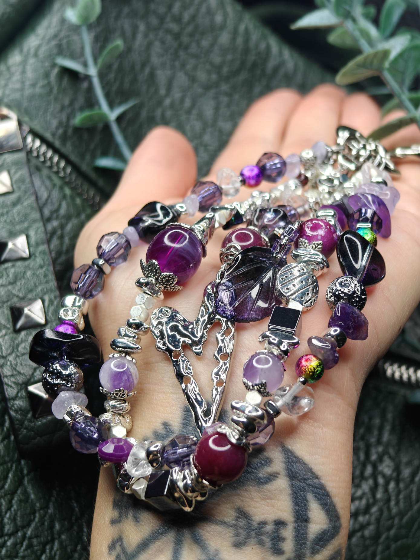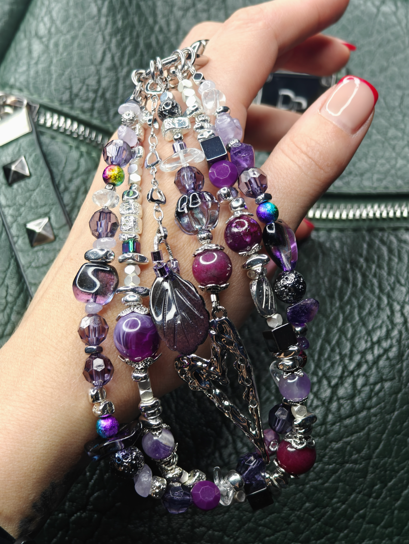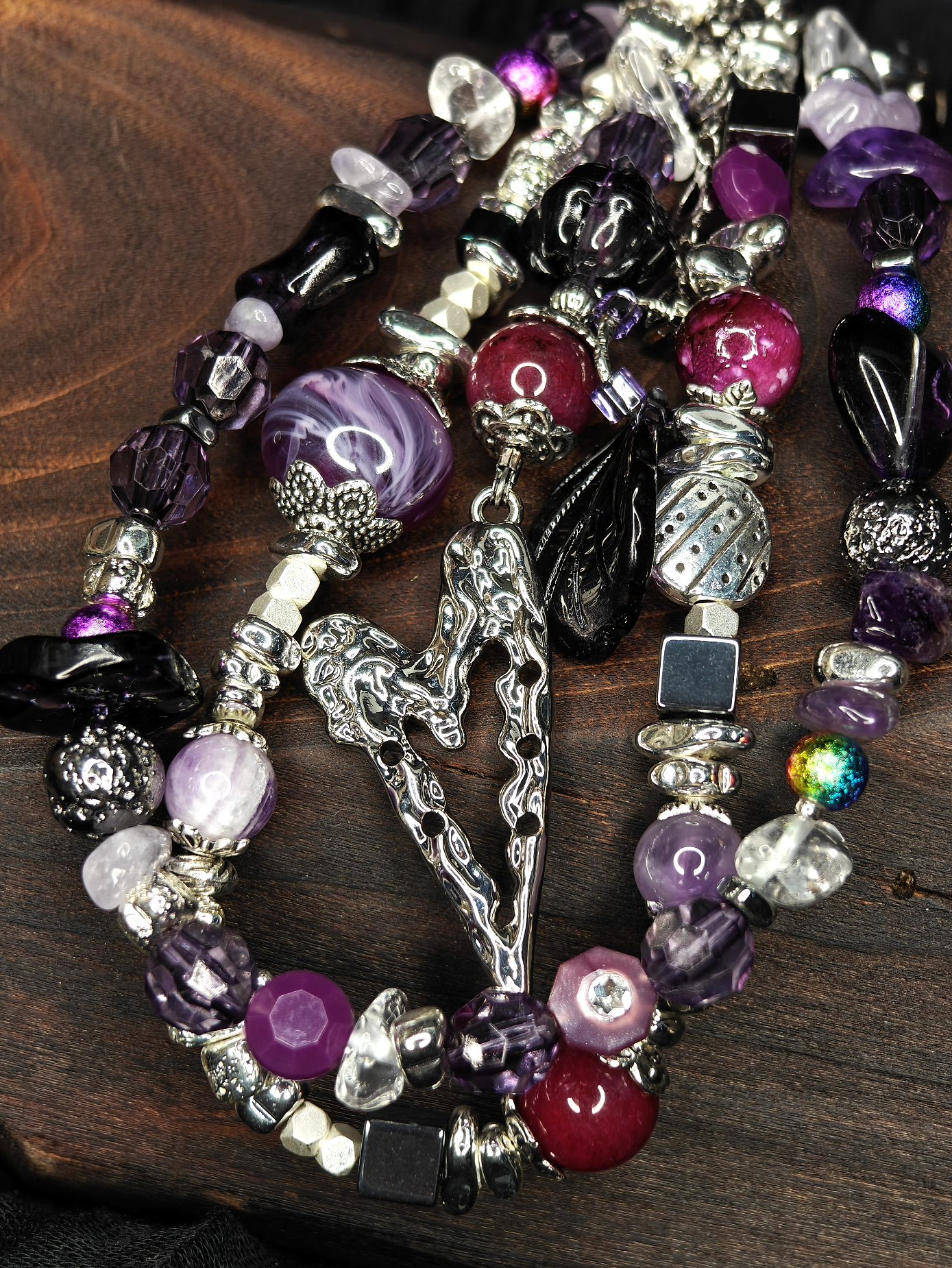 В основе — бусины вулканической лавы, гематита, аметиста, бисера, стекла и акрила. Фурнитура — серебро. Это почти тот же состав, что и у его «дикого брата», но душа здесь совсем другая.